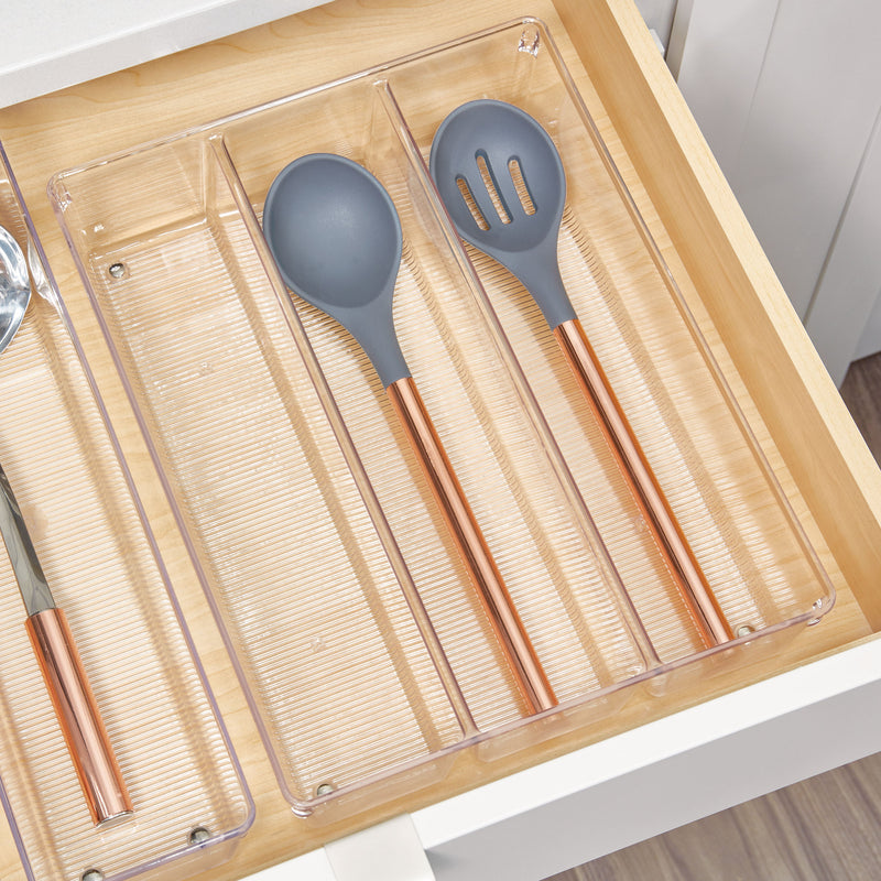 Sturdy acrylic drawer organiser with 3 compartments. Great for kitchen utensils and equally at home in an office or bedroom drawer for cosmetics etc.