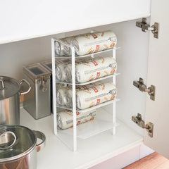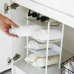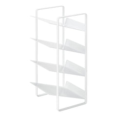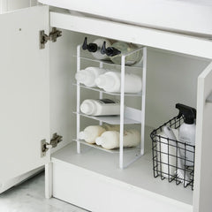 Make the most of cupboard or countertop top space with our new storage rack. Made from white steel, the rack features 4 tilted shelves perfect for storing bottles of juice, oil, detergent, shampoo etc. Each shelf has a large lip at the back to keep the contents in place. The practical and sleek design makes it perfect for popping inside a cupboard or on a countertop. Perfect for bringing organisation to kitchens, bathrooms, utility rooms etc.