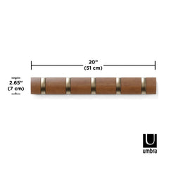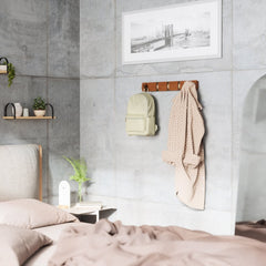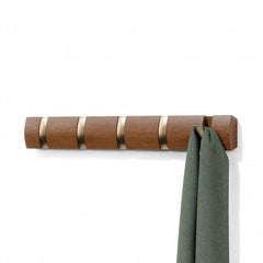 The Umbra Flip 5 Hook Rack, designed by David Quan, is a smart and stylish solution for organising coats, bags, and accessories in smaller spaces. Crafted from high-quality hardwood with a light walnut finish, this compact rack features 5 warm gold metal hooks that pull down when needed and flip back up when not, keeping your space neat and uncluttered.
