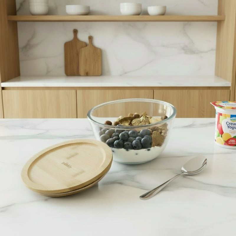 Our glass mixing bowl with bamboo lid is a great choice for those looking for a stylish yet long-lasting kitchen addition. It's been crafted from Borosilicate glass and features an on-trend airtight bamboo lid. With the bamboo lid removed, the bowl can be used in the freezer, fridge and microwave making it ideal for preparing and preserving food stuffs. 770ml capacity. Other sizes are available. The Borosilicate glass is naturally composed without BPA, phthalates and other toxins.