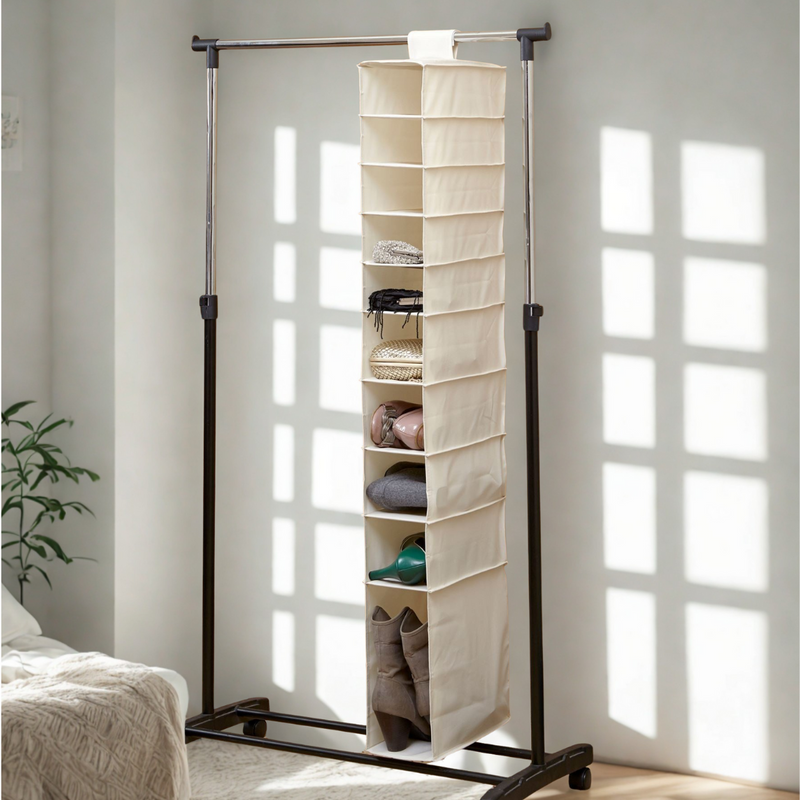 Our new hanging shoe and boot organiser has been designed to hold a variety of different styles of shoes and simply attaches onto a clothes rail using velcro to clear the clutter The cream organiser has five small pockets for pumps and sandals etc, four larger pockets for trainers and shoes plus shoes with a heel and a larger pocket at the bottom which is great for storing a pair of boots. A neat and quality item to assist with making best use of space.