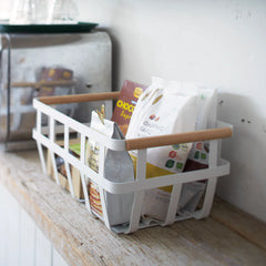 This practical kitchen storage basket made from high quality steel and wood is the perfect addition to your living area. The handles are made of elegant wood ensuring it can be transported easily with contents inside. Perfect for decluttering a cupboard or how about for open storage on a kitchen shelf. These well-made kitchen storage baskets are ideal for storing tins, jars and packets or how about cloths, hand towels, tea towels etc. on a utility room shelf. Each basket comes with handy felt pads underneath to protect your shelves from scrapes and scratches.