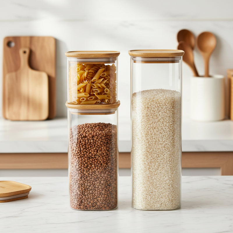 They're the ideal size for storing pasta, rice, flour, granola, sugar etc. The canisters have a natural bamboo lid that has a silicone gasket to seal it tightly. The lids are also slightly curved which allows them to be stacked saving precious cupboard and countertop space. These sturdy canisters not only make identifying the contents at a glance easy, but they're also great for bringing a modern and warm touch to your kitchen. Easy to clean, the seals are removable, and the boxes are dishwasher safe. Can also be purchased separately. Our glass canisters with bamboo lids are a great choice for those looking for something long-lasting.