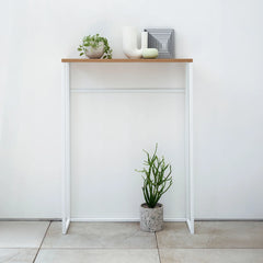 Available in a choice of white with light wood or black with dark wood, our new console table is an ideal solution for narrow hallways where space is at a premium. Keys, notepads and pens, ornaments etc can be stored on the top of the unit whilst umbrellas and dog leads can be hung from the four included storage hooks. A shoe rack, house plants, pets bowls etc can be popped on the floor underneath. At only 18.5 cm deep it's a great choice for use in narrow spaces.