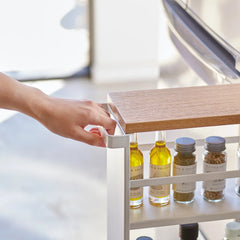 Our stylish new Yamazaki slimline kitchen storage trolley and shelving unit is ideal for tightest of unused spaces and the handy castors make it easy to move when needed. There are three generous shelves across this well-made unit for bottles of water, wine and fizzy drinks, foodstuff, kitchen towels, oils and condiments etc. The unit is finished in white with a solid wooden top that sits at counter height. Simple self-assembly required