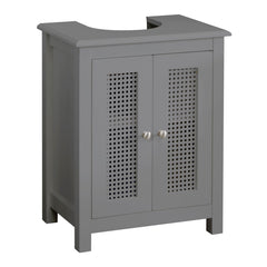 Set your bathroom up with both storage and style with our new under basin storage unit. Behind the double rattan effect doors you'll find one height-adjustable shelf as well as the unit's base that provides plenty of space for cleaning products, toiletries, spare toilet rolls etc. This under sink storage unit is sure to fit in with any bathroom decor. Choose from white or grey. Simple self-assembly required.